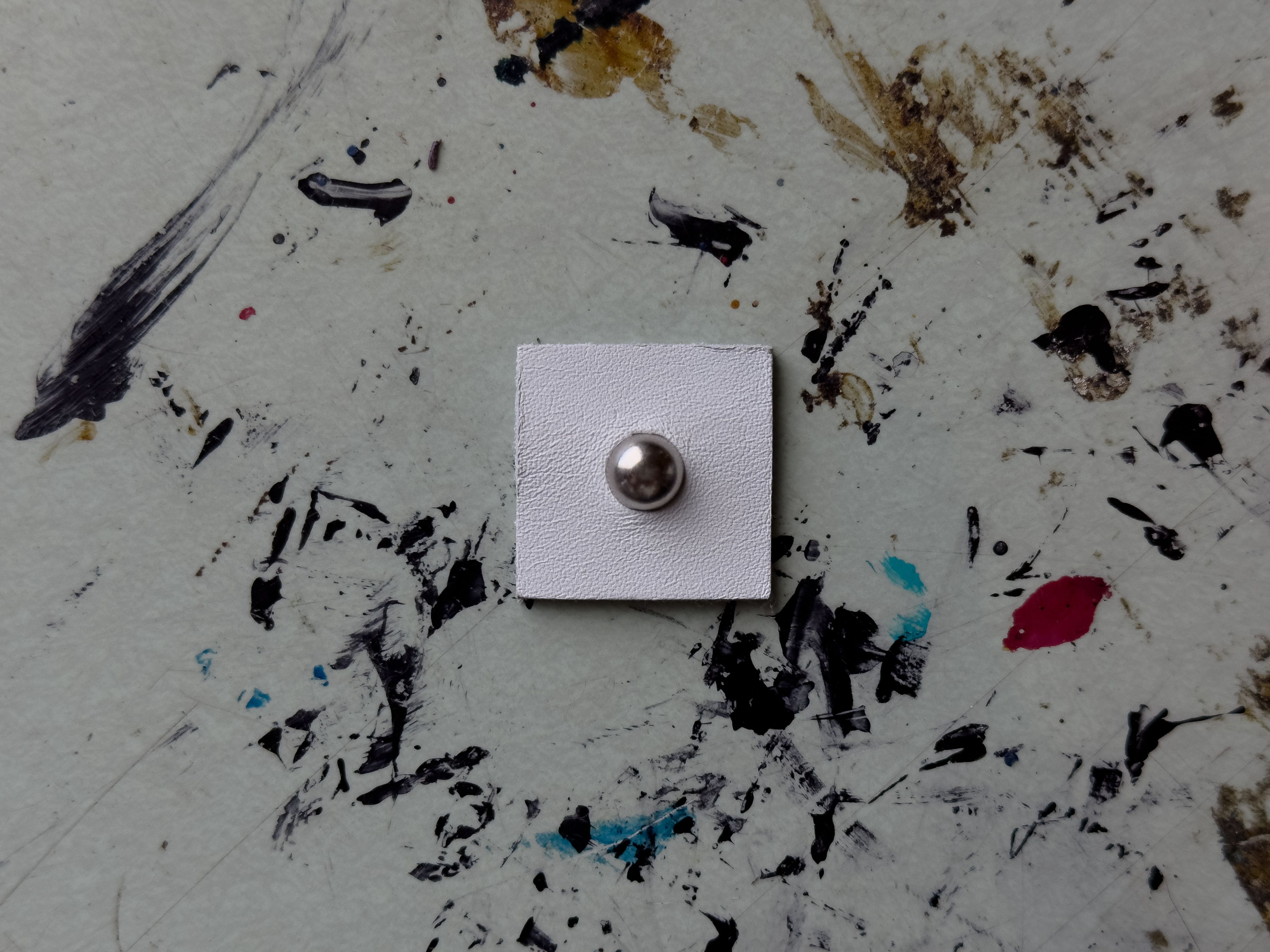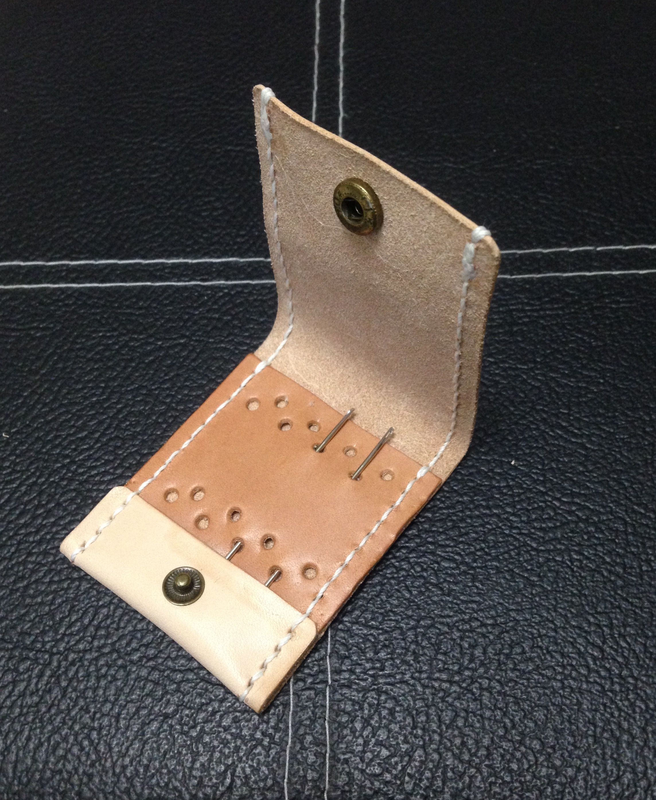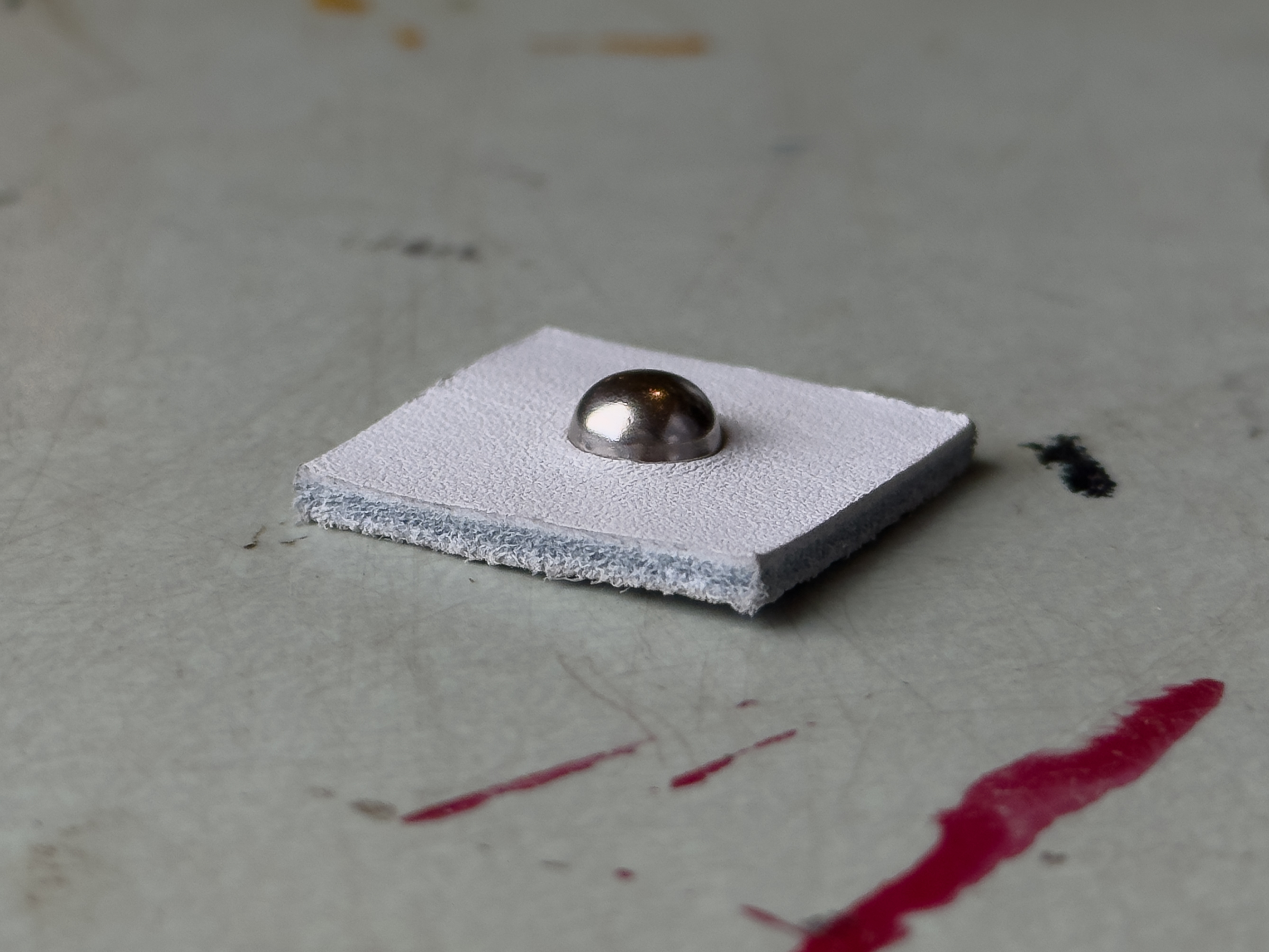 I cut this test swatch of white kip to try placing a 5/16” pronged dome stud into the leather.