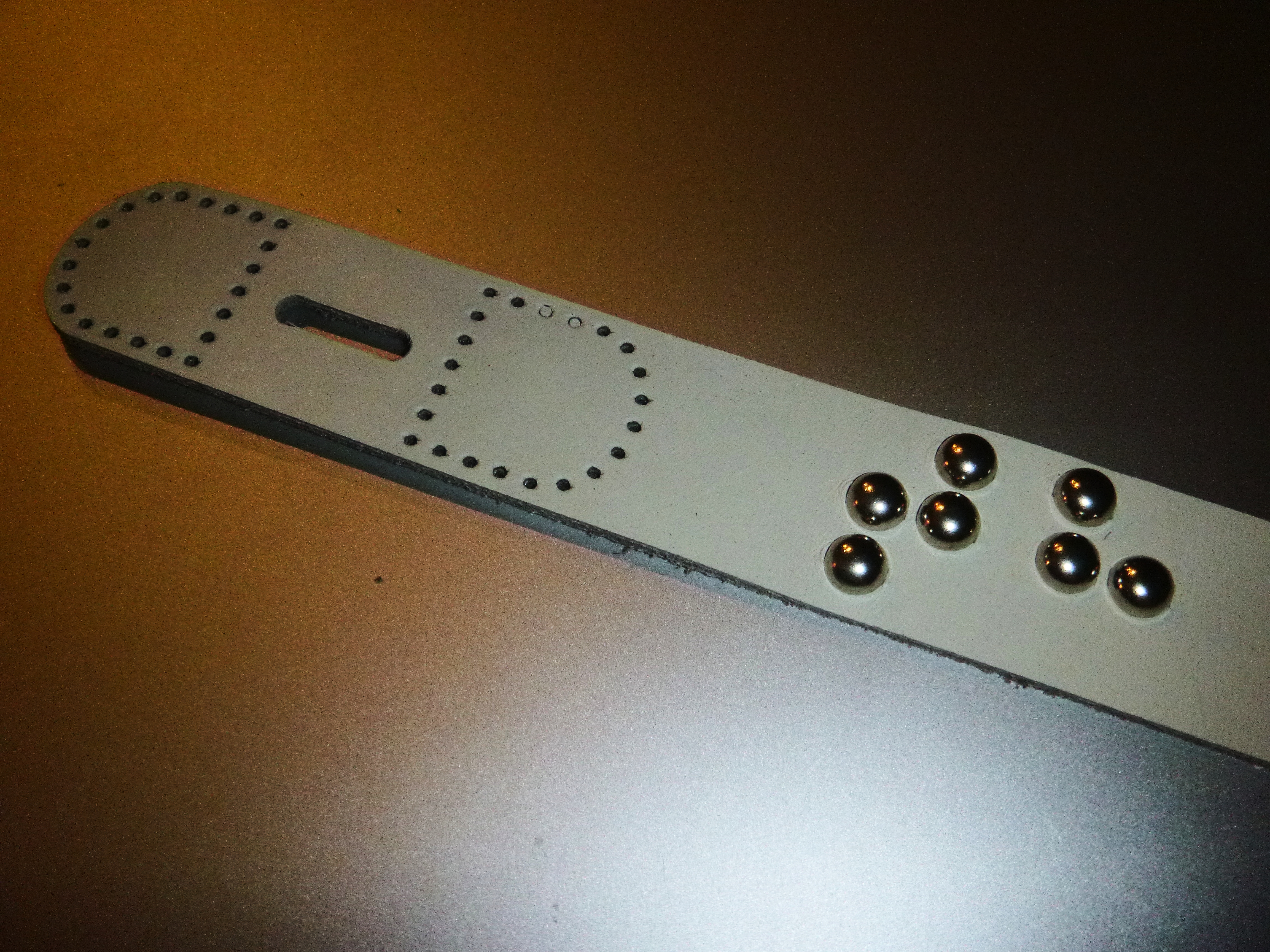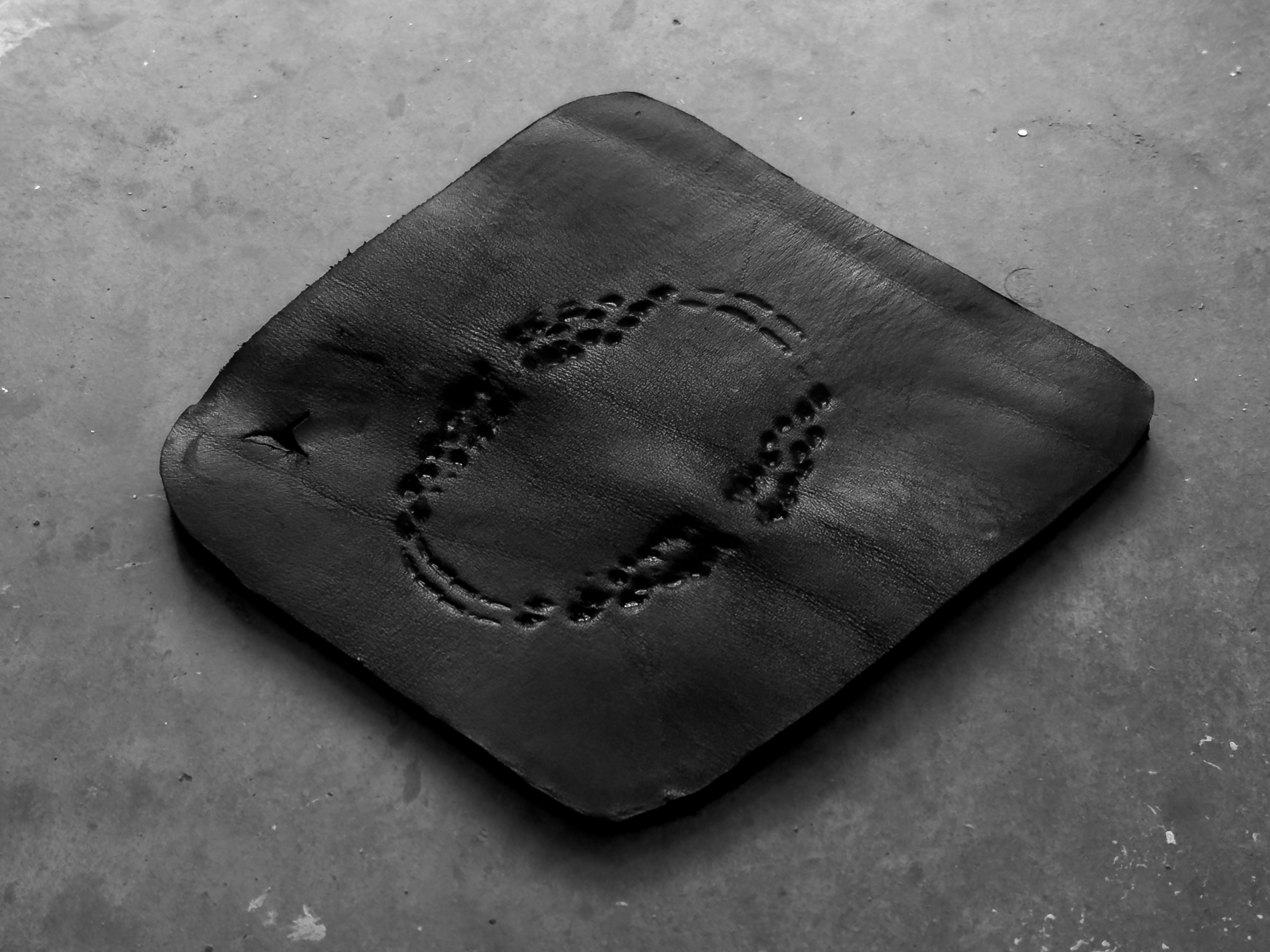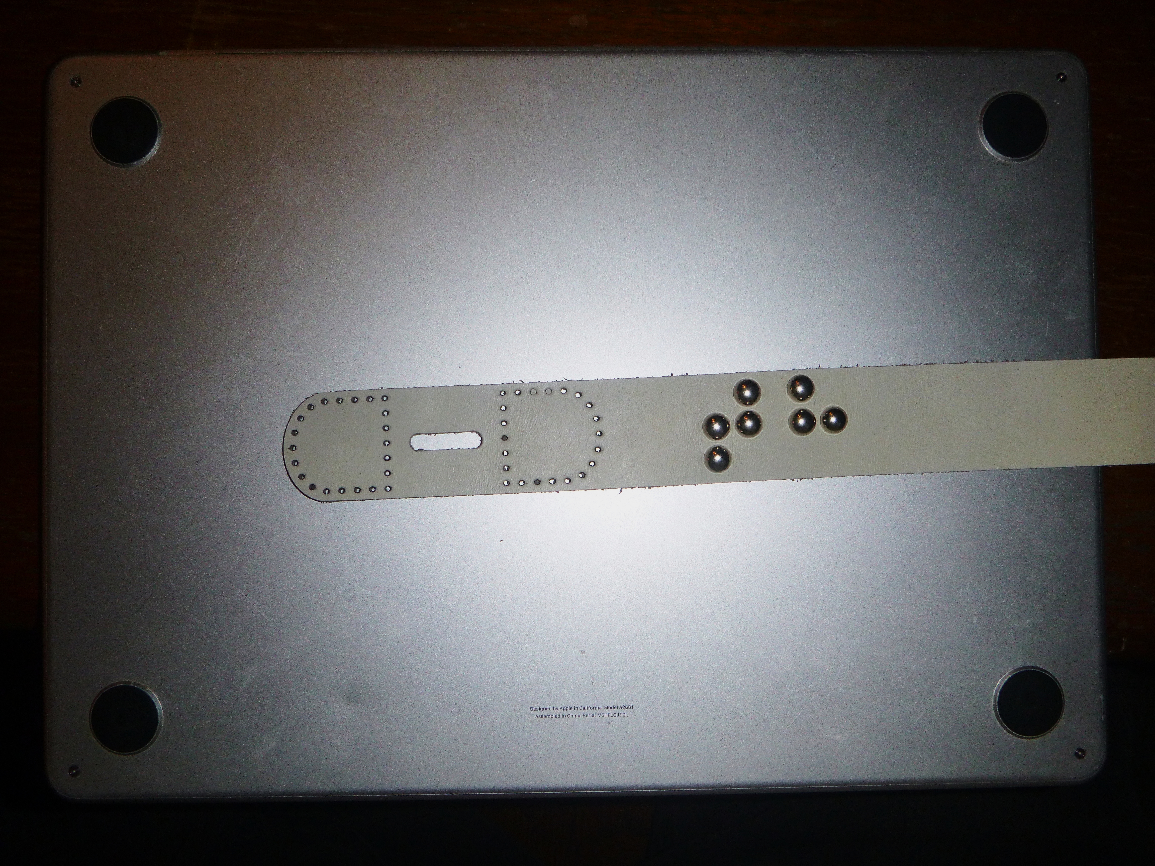 I cut this test swatch of white kip to try placing a 5/16” pronged dome stud into the leather.
