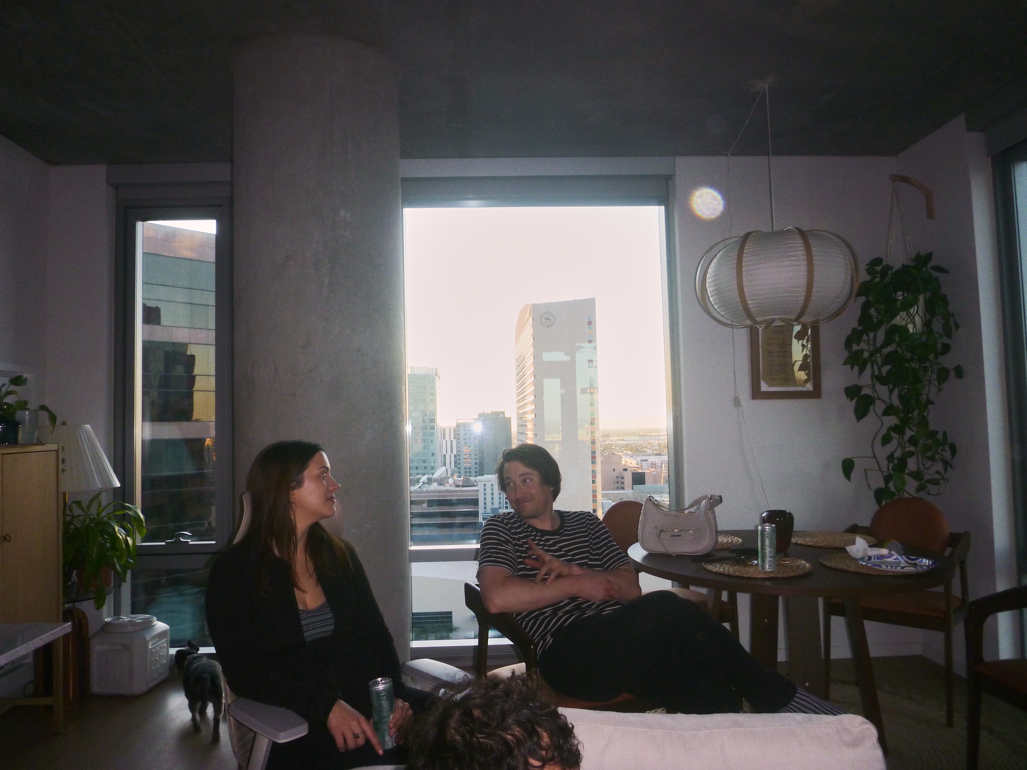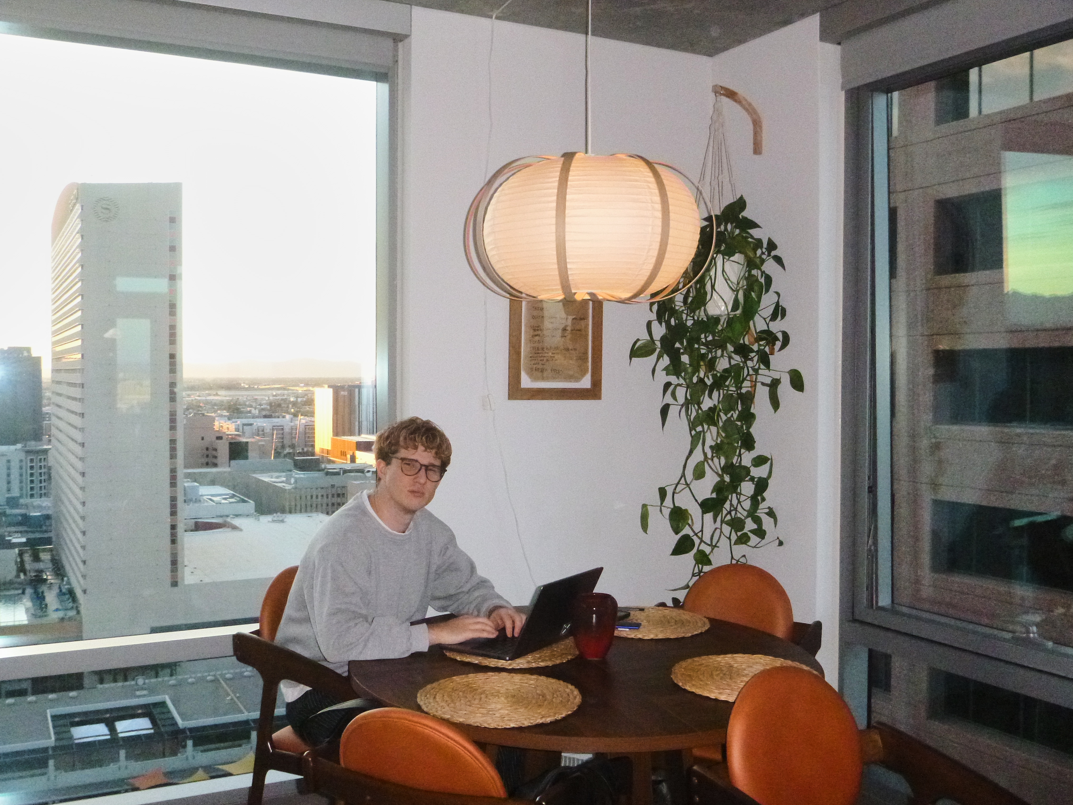 I watch the traffic on the I-10 from the 21st floor of 440 E Van Buren St. In the room over, a man I never see assembles a dresser. Before Hannah leaves for work, we talk about our friends. I sit down at her desk and edit video. Josef sits at his desk to my left, editing video with the Knicks game playing on his monitor. I go down to the 7th floor to use the free espresso machine. I call Joriel. We talk about our plans this weekend. Eventually, I order pizza and we put our work aside to watch the end of the Knicks game, as well as the first and second overtime periods. We talk about the sound mix of live NBA broadcasts. We try to remember what we talked about the night before. Hannah comes home. We go downstairs and work on our laptops more. I ask Claude to build a GUI for converting .MOV files to GIFs. I try it, and upload a few to Are.na.