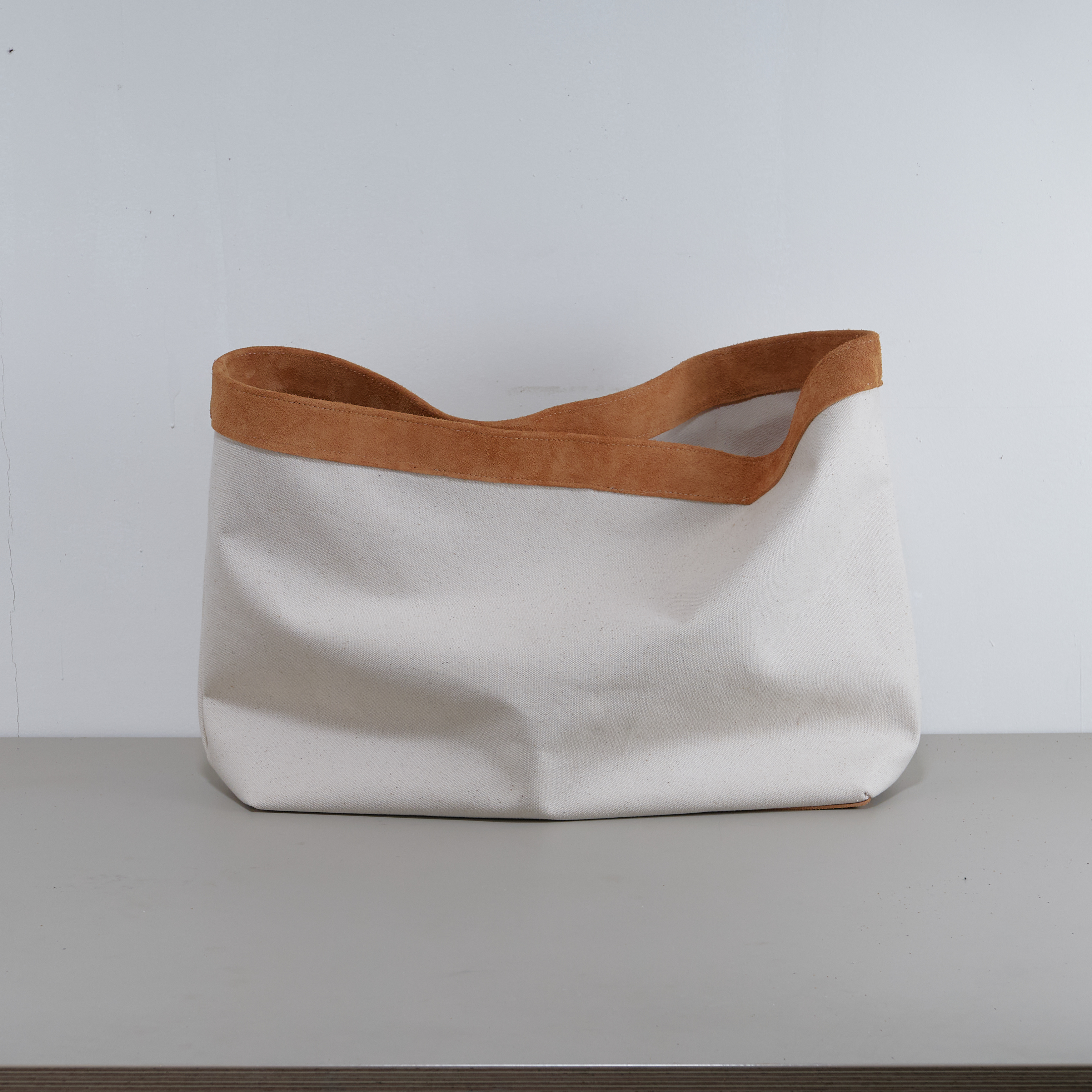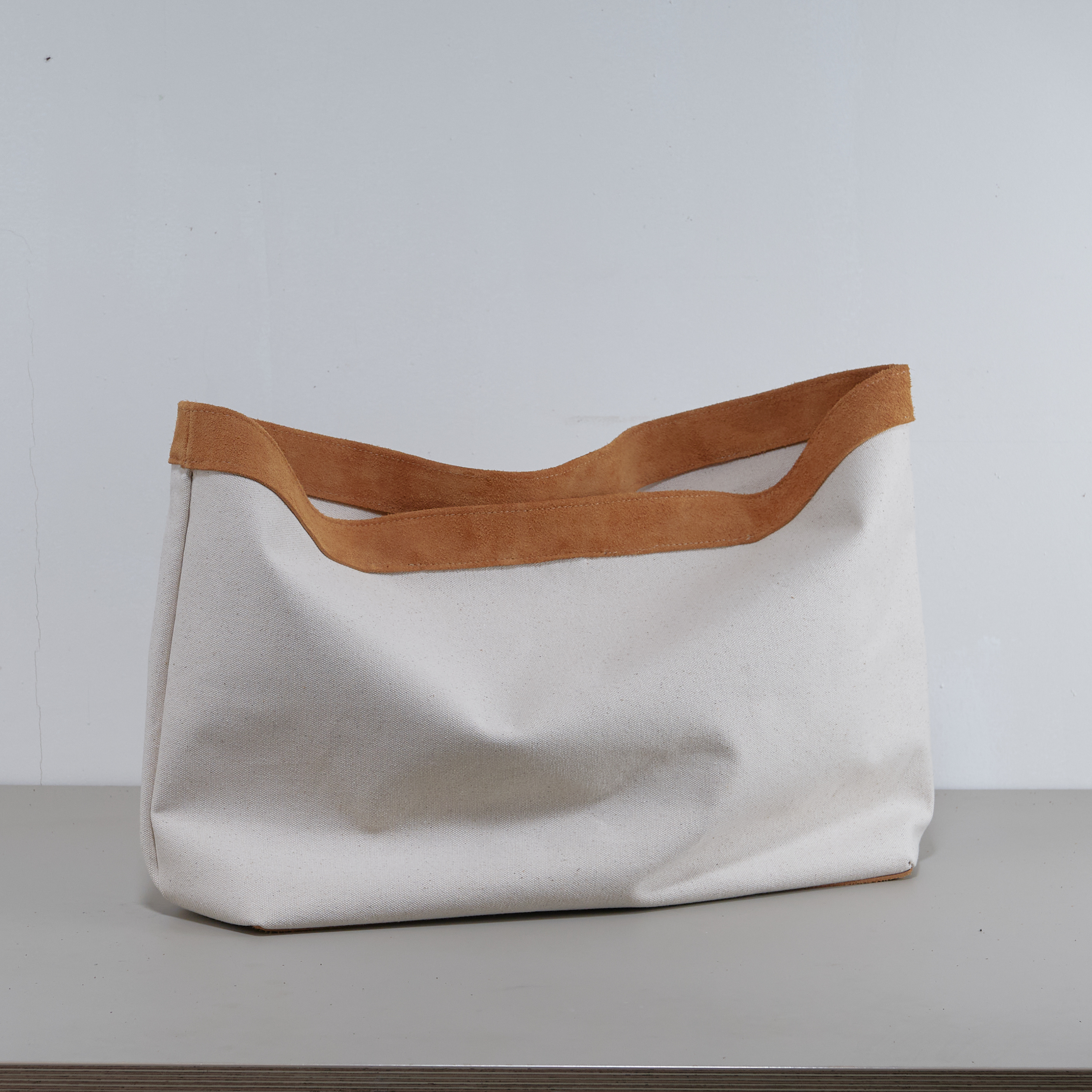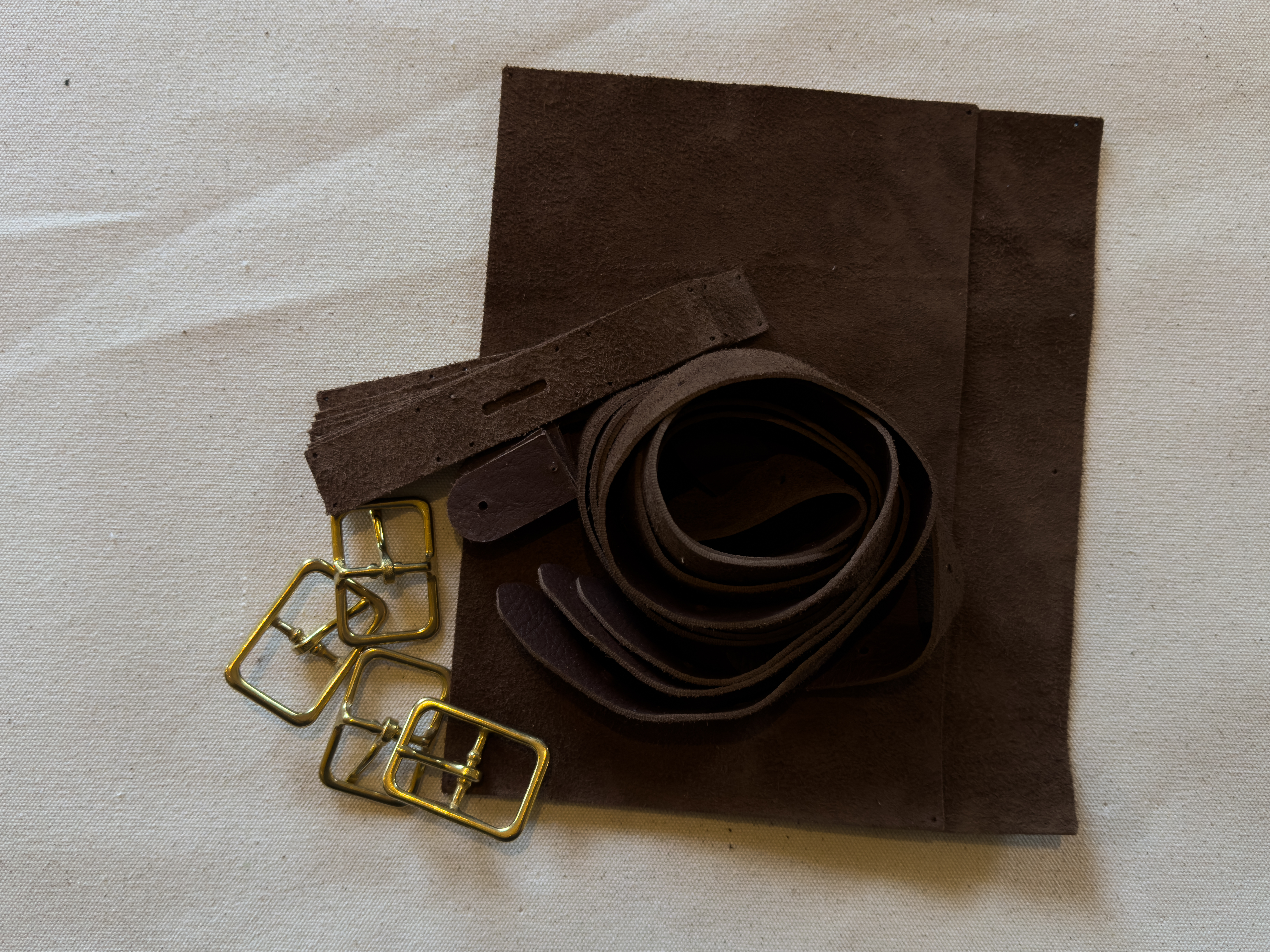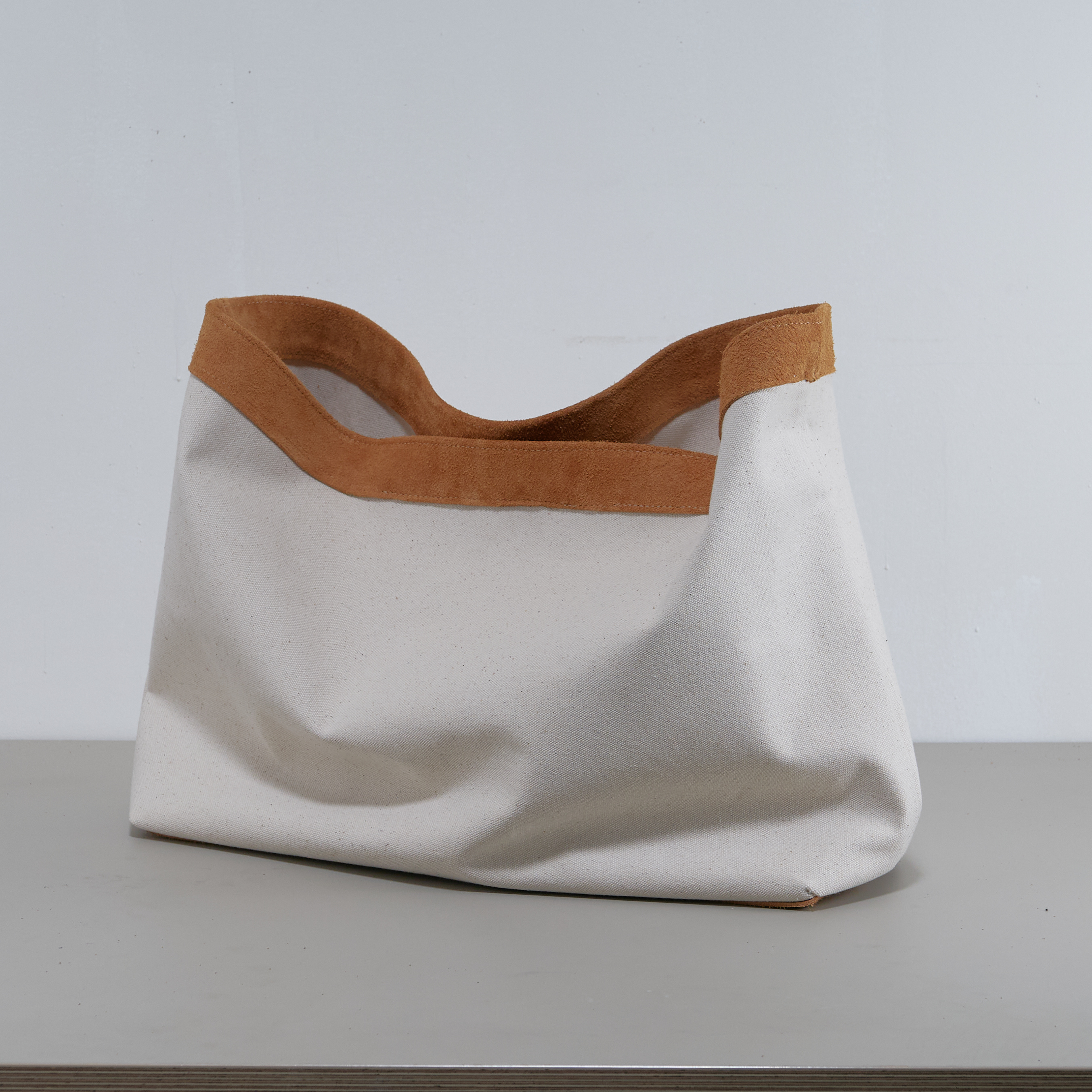 I cut out canvas and leather for another version of our new bag and leave it on Minerva’s table to sew.