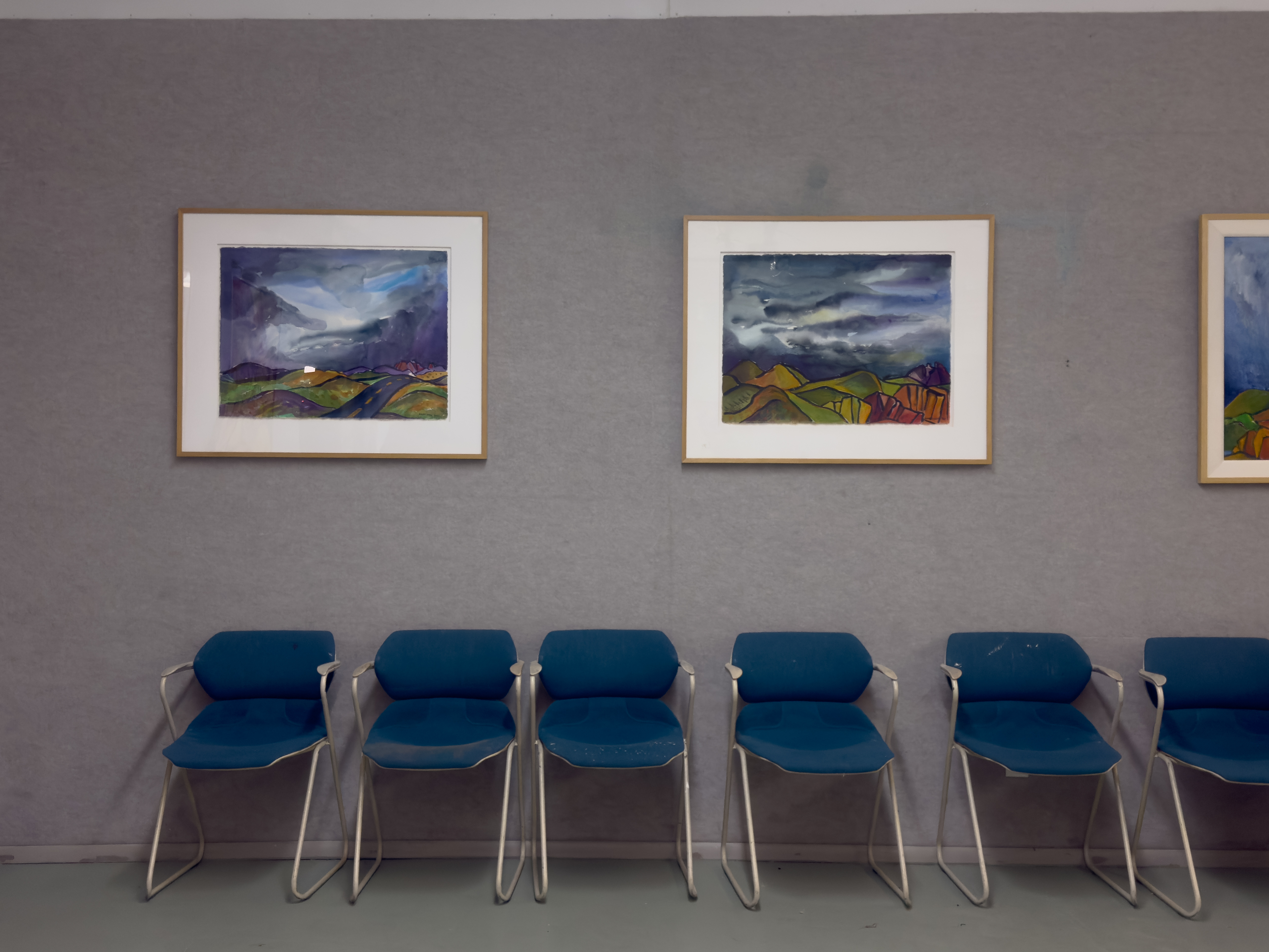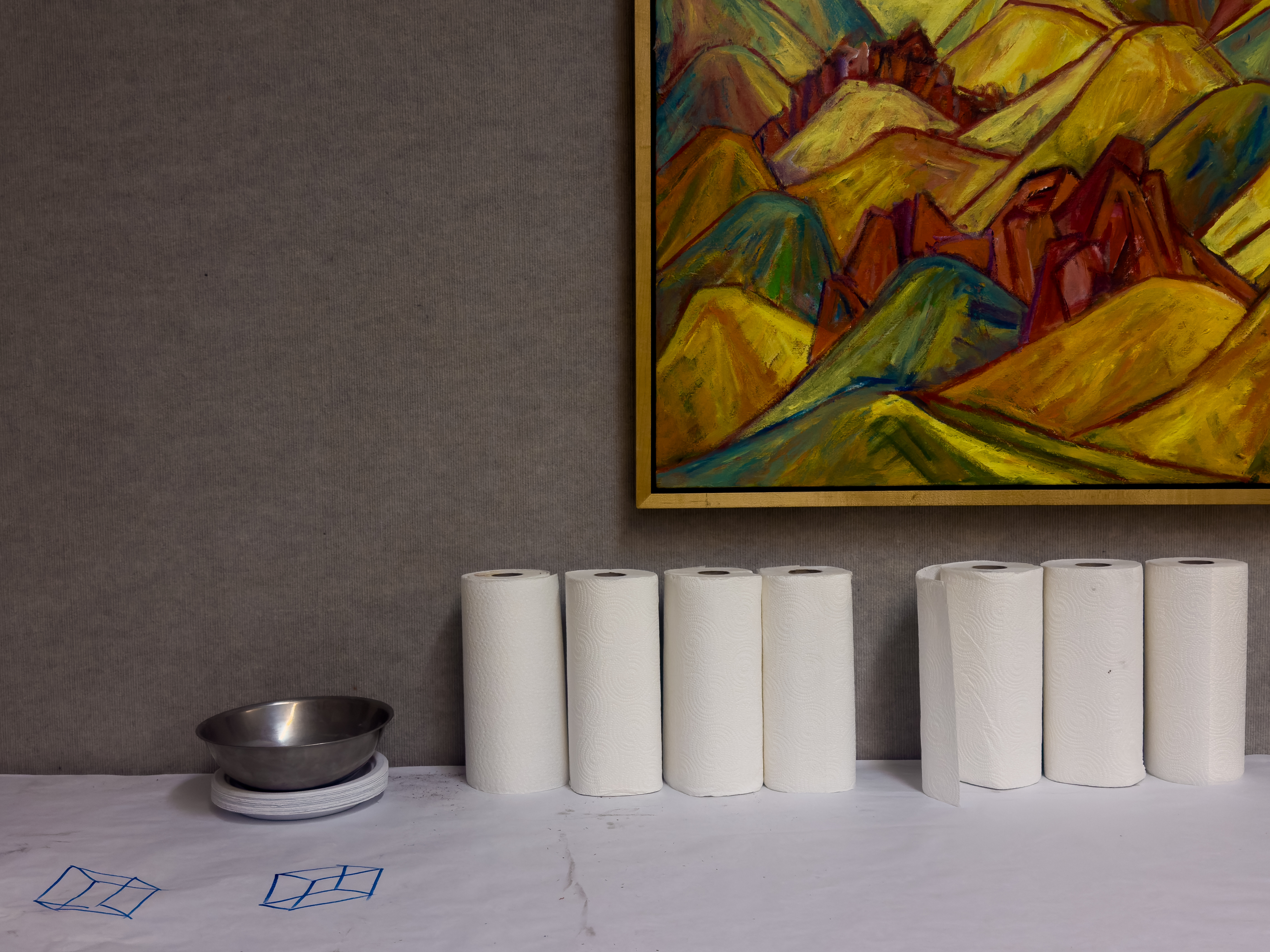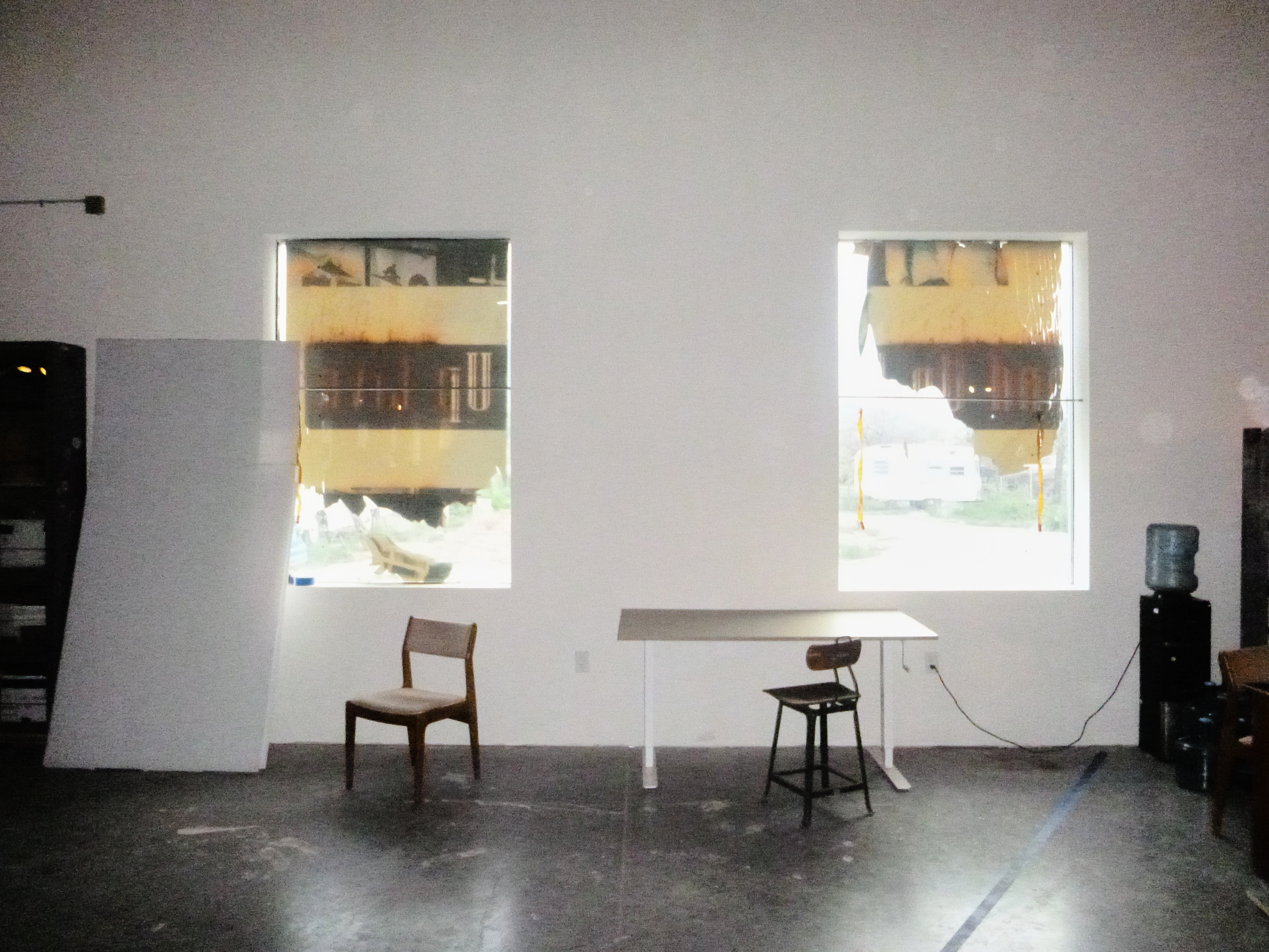 I sit around a table with Phil, Lee, and a handful of other artists. We talk about James Perkins, Kid Cudi’s painting practice, the Critical Response Process and the tagline of the exhibition: The African American experience. Vi comments on how the room we are sitting feels like a production set. Eventually, I urge everyone to go outside and look at the rocks. Only Lee joins me in the parking lot.