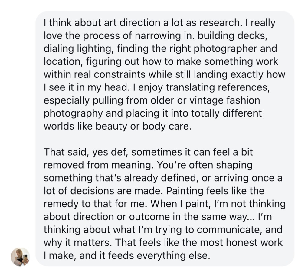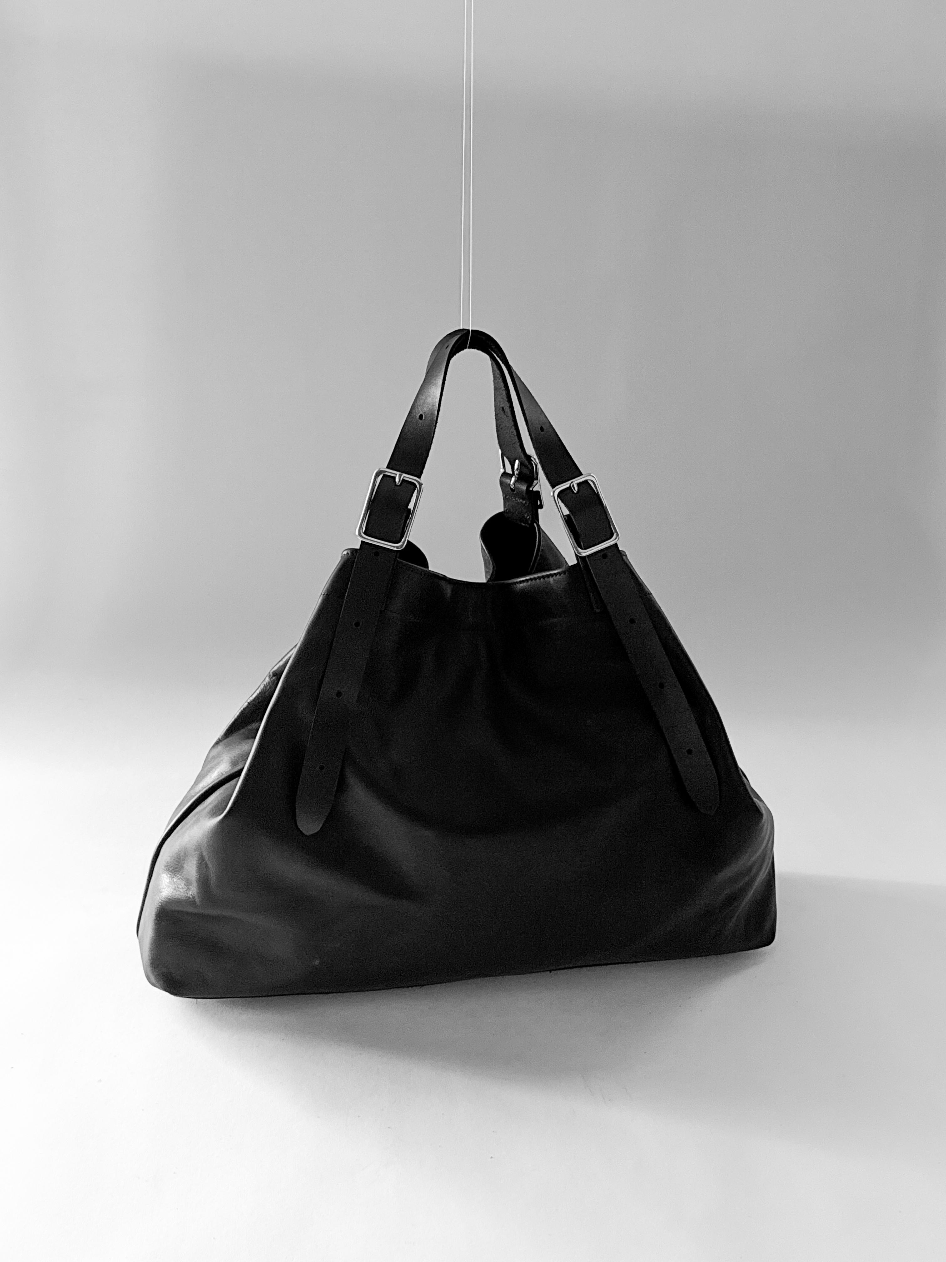 Caroline sends me a copy of her portfolio via Google Drive. I pitch to Sebastian the idea of collaborating with her to create a 1/1 canvas bag in our latest silhoutte. We discuss what buckle to source and how we can accomodate various plating styles, including a saltwater patina.