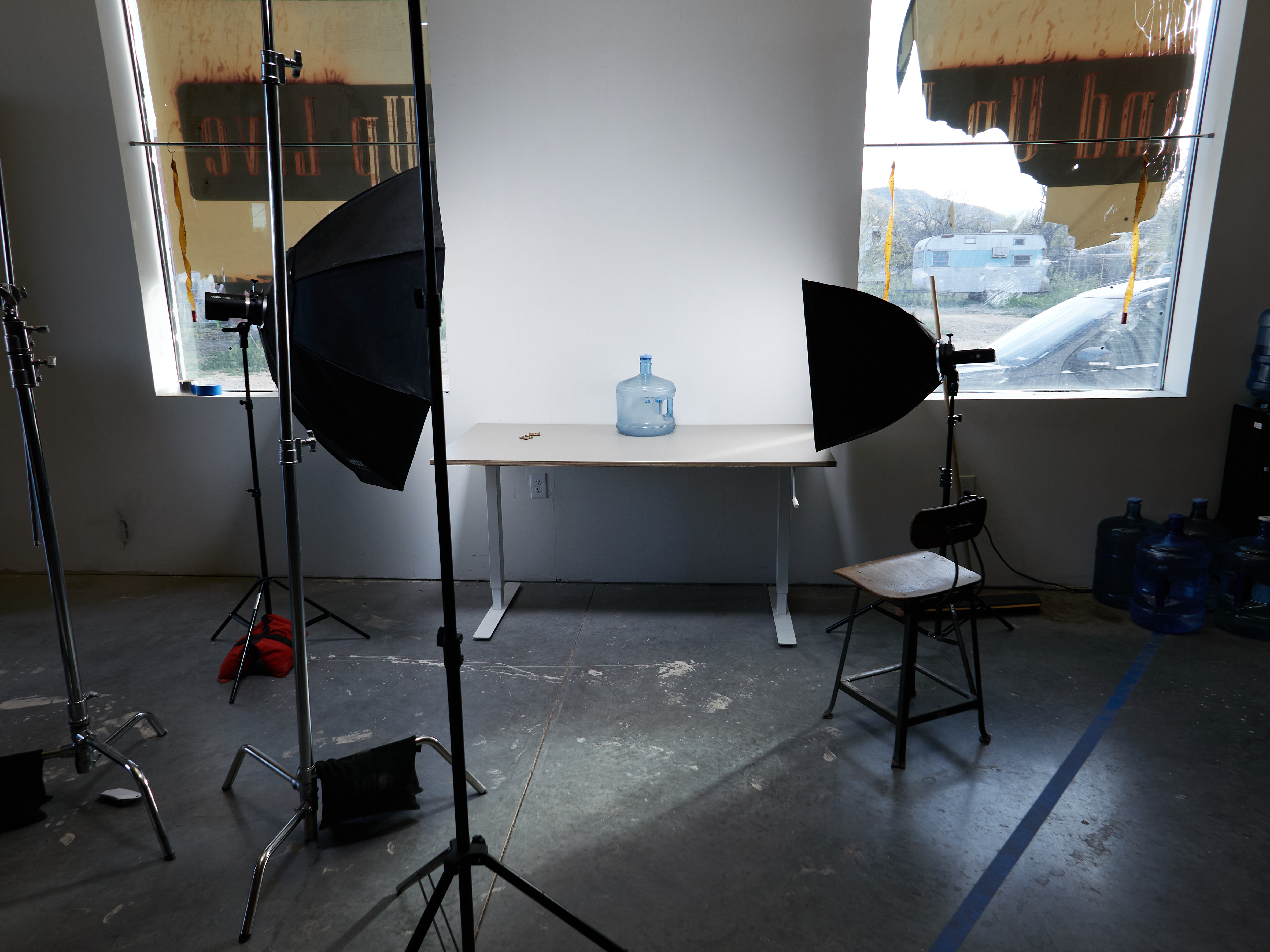 I set up an empty desk and strobes along the south wall of the Ezra Arthur warehouse. My intention is to recreate the natural lighting I used to photograph everything at our last shop downtown. I am not far off.