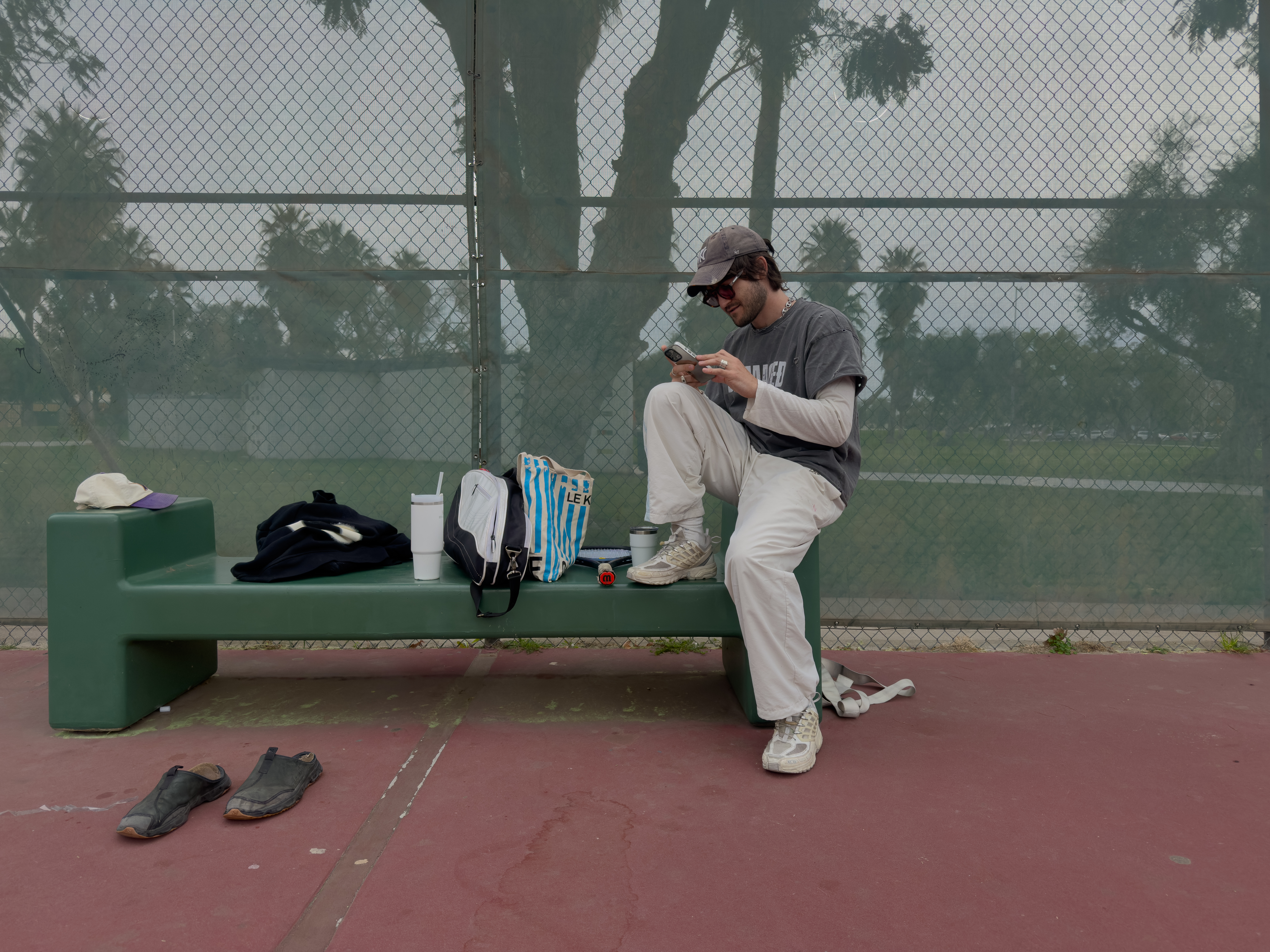 Gino and I play tennis at a public court in Palm Springs. I have a hard time keeping up at first. I haven’t swung a tennis racket in years.
