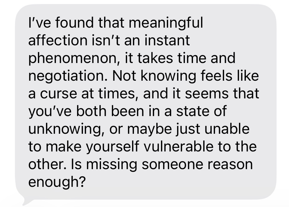 I wake up. It is dark outside. Unlike the night before, memories of anxiety from the middle of the night do not flood my mind. I am focused on a strange dream I woke from, a white haired, dark-skinned man apprehending me on the street while I wait for a woman I have never met. I wander into the living room where I left my glasses and then back to bed. I scroll through a handful of texts; it feels too early to respond but I do anyway. A few minutes later, my phone vibrates. Emily is awake too. I share my dream, I start to fall back asleep. When I wake up in the morning, I read four screenshots she sent me at 4:27 AM.
