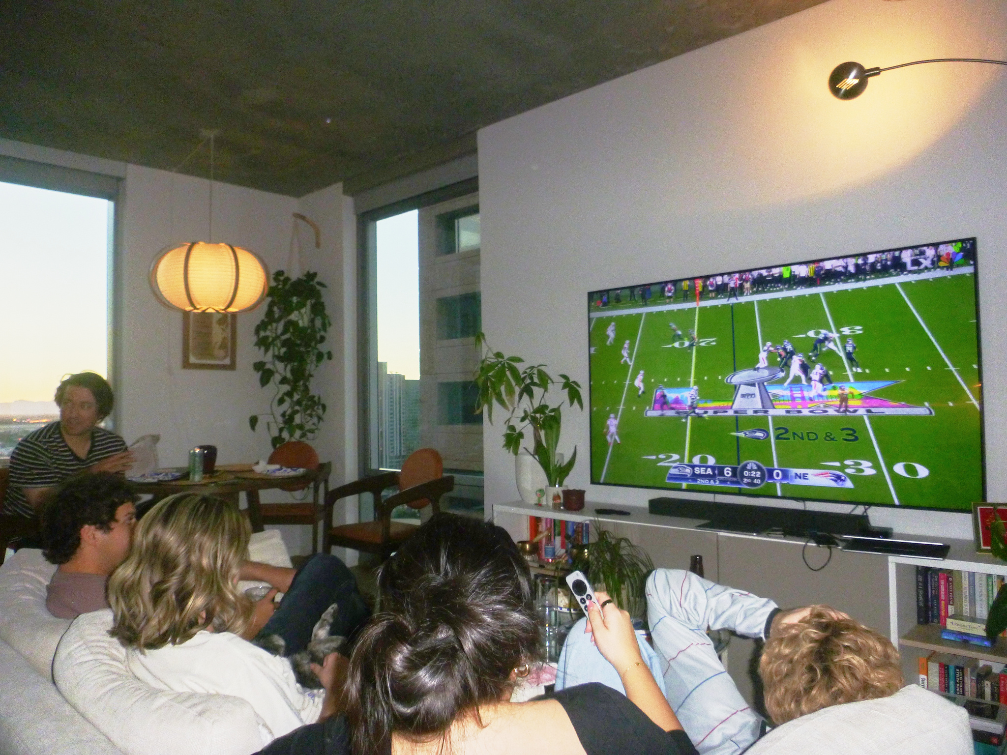 At Hannah and Josef’s, we watch Super Bowl LX. Bad Bunny appears for possibly the best halftime show I have ever seen. We rate the commercials out of 10 and few score higher than 8. For every touchdown scored, we all do shots of vodka (except Matt and Chelsey) with pickles or lime. We fall behind in the fourth quarter and the Seahawks begin to dominate.