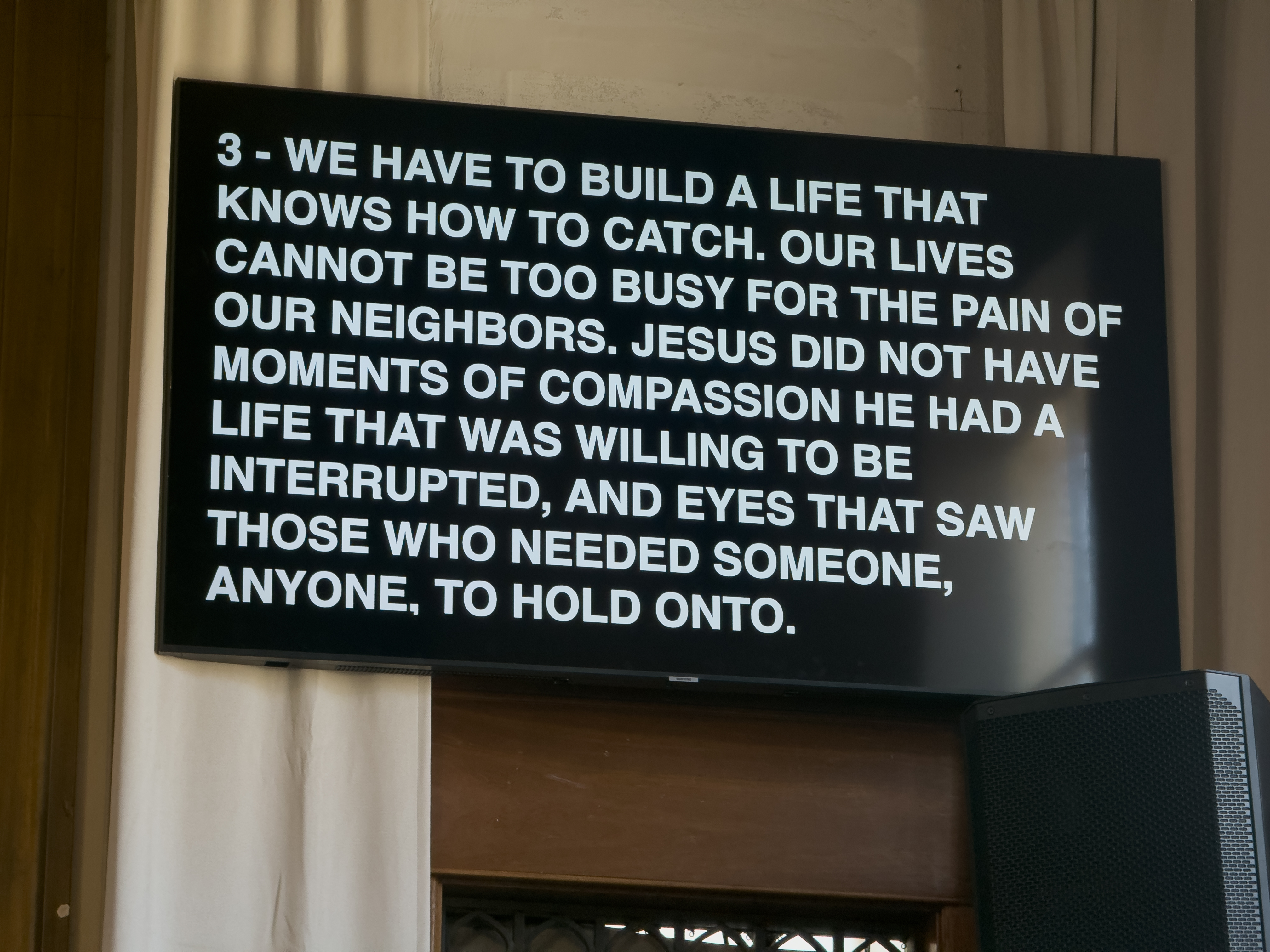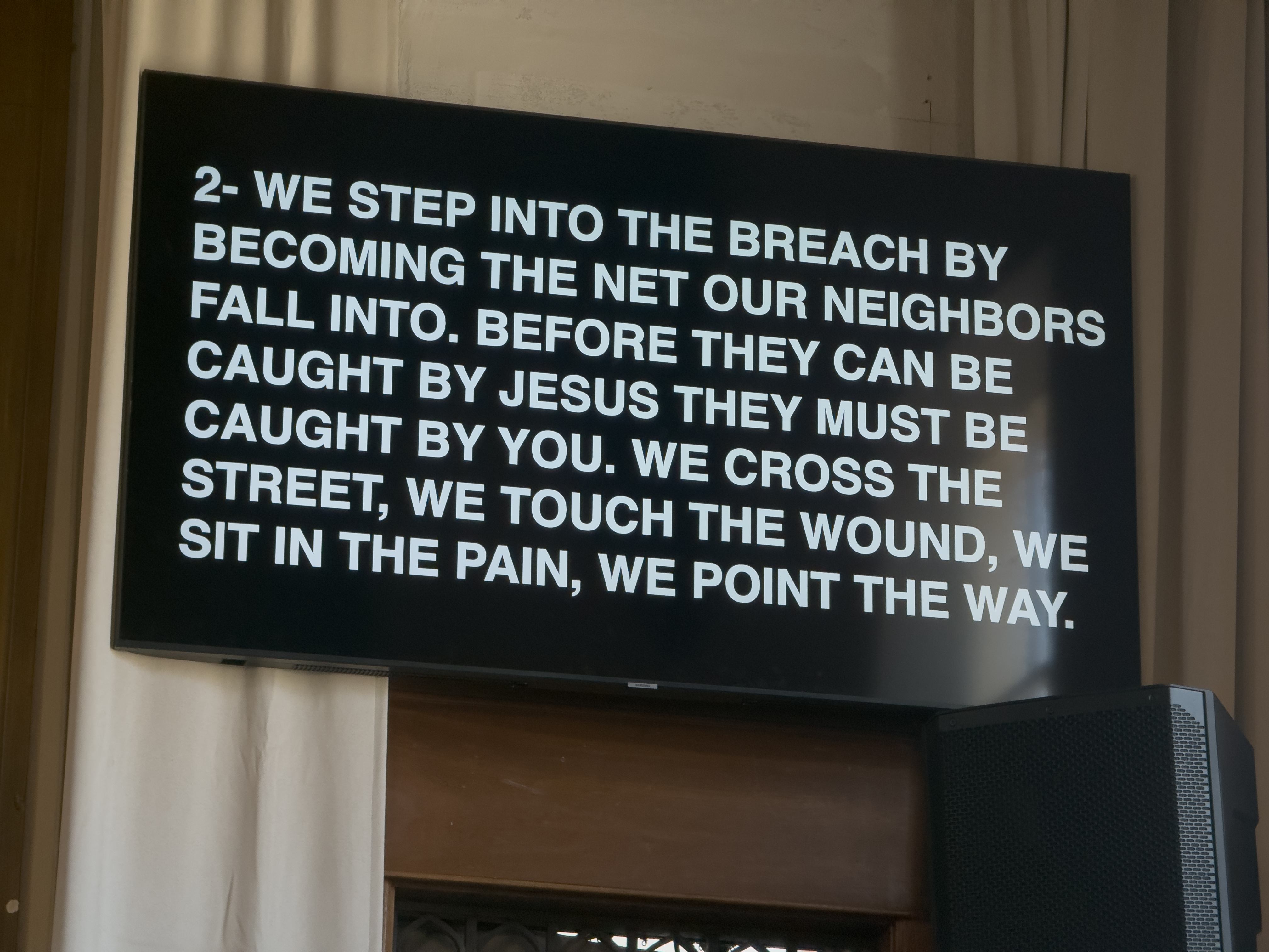 I meet my mom at Fixate for the 12:30 PM service. Hanna and Jorgen sit by us. We talk a bit. I take notes. After service, a man in a wheelchair, Eddy, asks me to push him to the bus stop. He says he lives near 83rd Ave and rides the bus to the church every weekend.