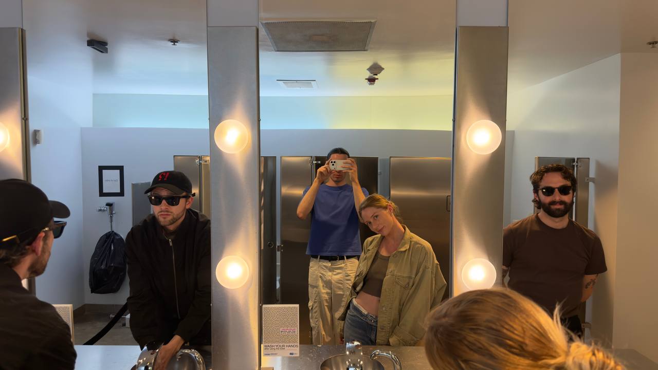 I sneak Caroline into the men’s restroom to snap a mirror selfie with the boys